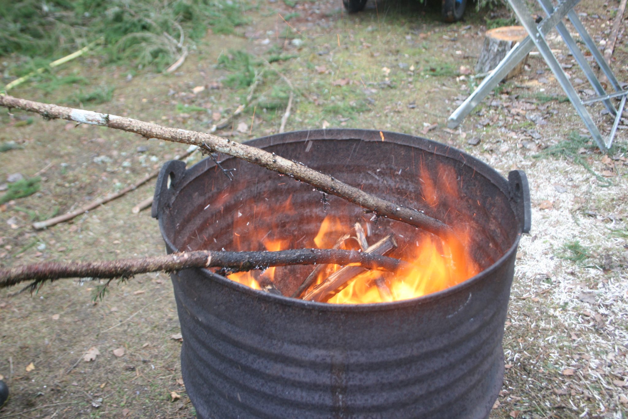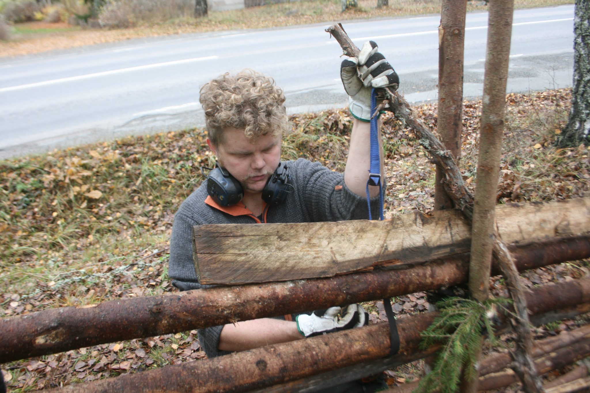 – Det handar om cirka 250 meter gärdesgård som byggts dels på framsidan av hembygdsgården, dels mot baksidan, informerar Lennart Åhgren medan kollegan spänner dit en av de sista granvidjorna på gärdesgården, som värmts över öppen eld innan.