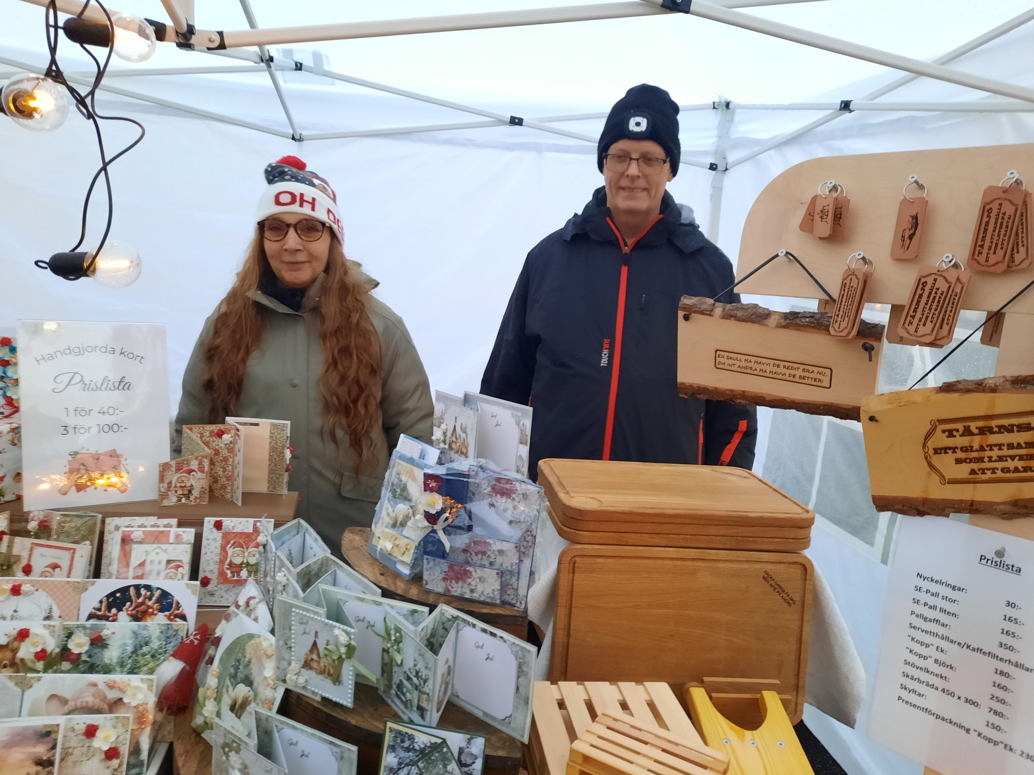 Årets julmarknad i Tärnsjö, som arrangerades av Tärnsjöföretagarna på söndagen, var paraplytät. Trots detta sökte sig en hel del ortsbor till samhällets centrum där också ett stort antal ”knallar” fanns på plats i parken med försäljning av potentiella julklappar i form av både ätbara produkter och hantverk. Bland annat handgjorda julkort.