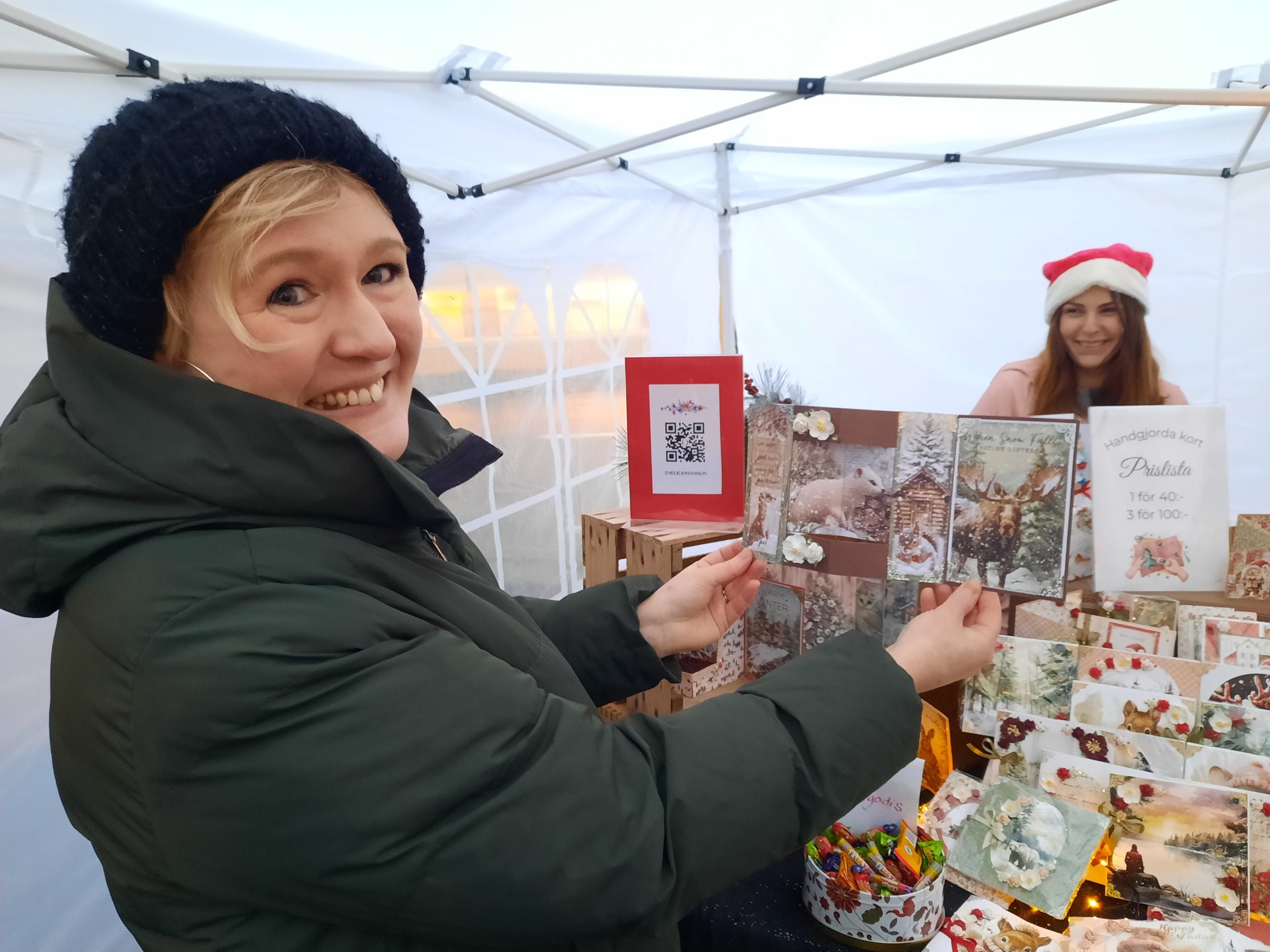 – Exempelvis de här gör jag från grunden, och smyckar på olika sätt, berättar Tärnsjöbon Emelie Johansson och viker upp ett av många vackra egenproducerade julkort hon ställt ut till försäljning.