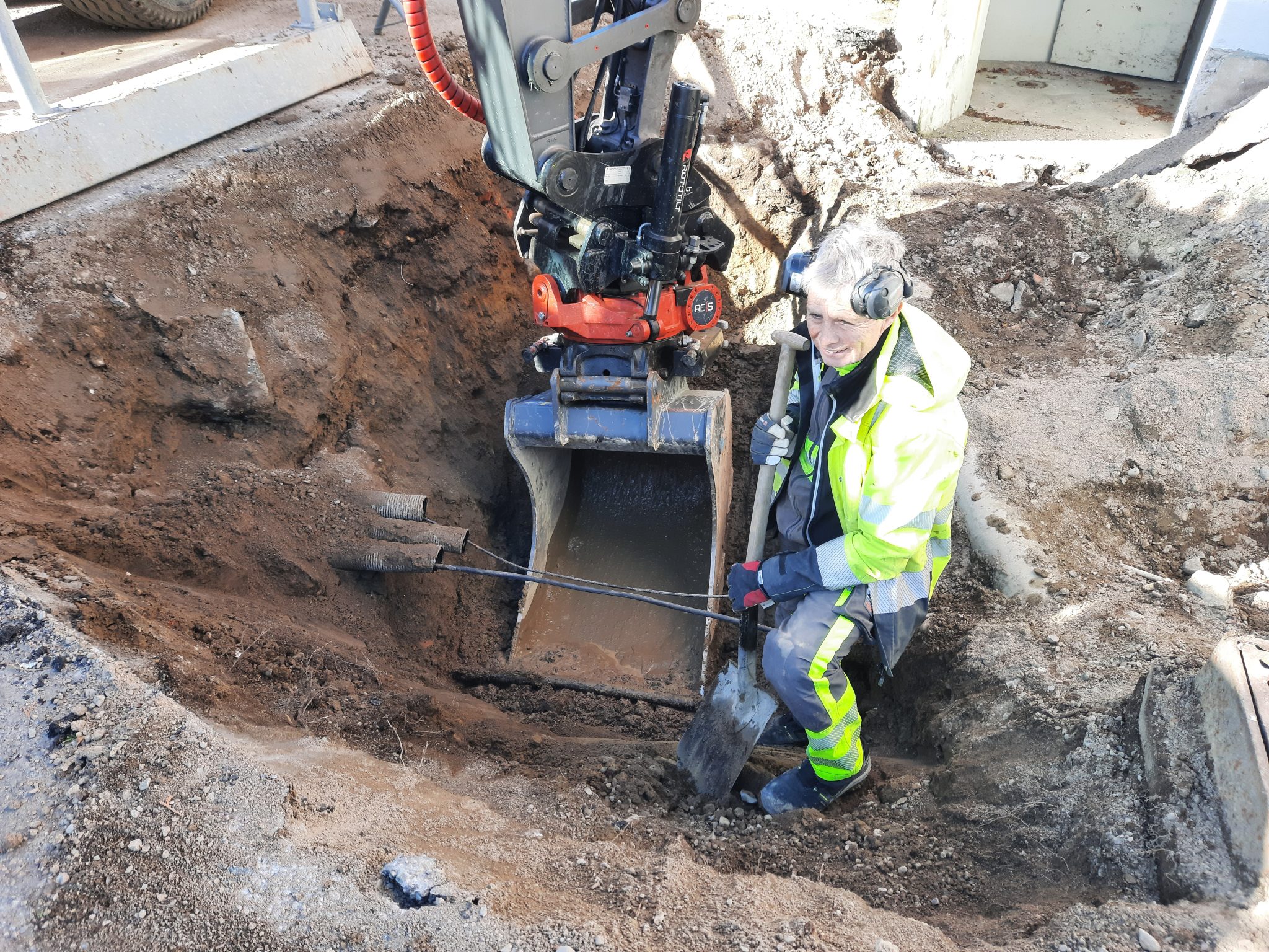 – Just nu gräver vi fram den befintliga vattenledningen från huvudbyggnaden som fram till nu försett de intilliggande seniorlägenheterna med vatten. Nu ska den pluggas inför rivningen, upplyser Joakim Wikblad från entreprenadföretaget H Mark.