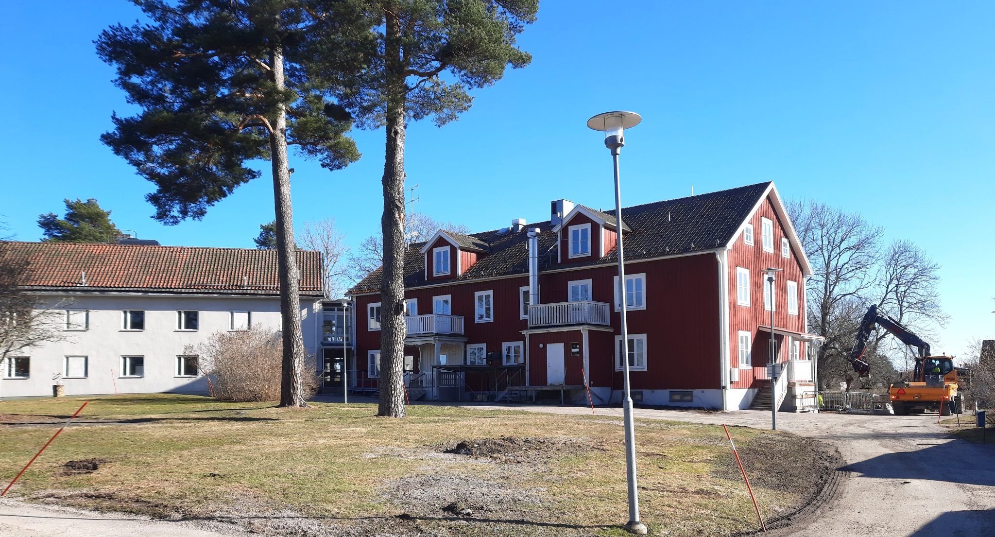 Vid Tallgården i Östervåla pågår nu arbetet med de sista förberedelserna inför rivningen av det tidigare äldreboendet på Gräsbovägen. När OrtsAktuellt gör ett nedslag är både grävpersonal och rörmokare i full aktivitet. Vid gaveln på huvudbyggnaden pågår grävarbete.