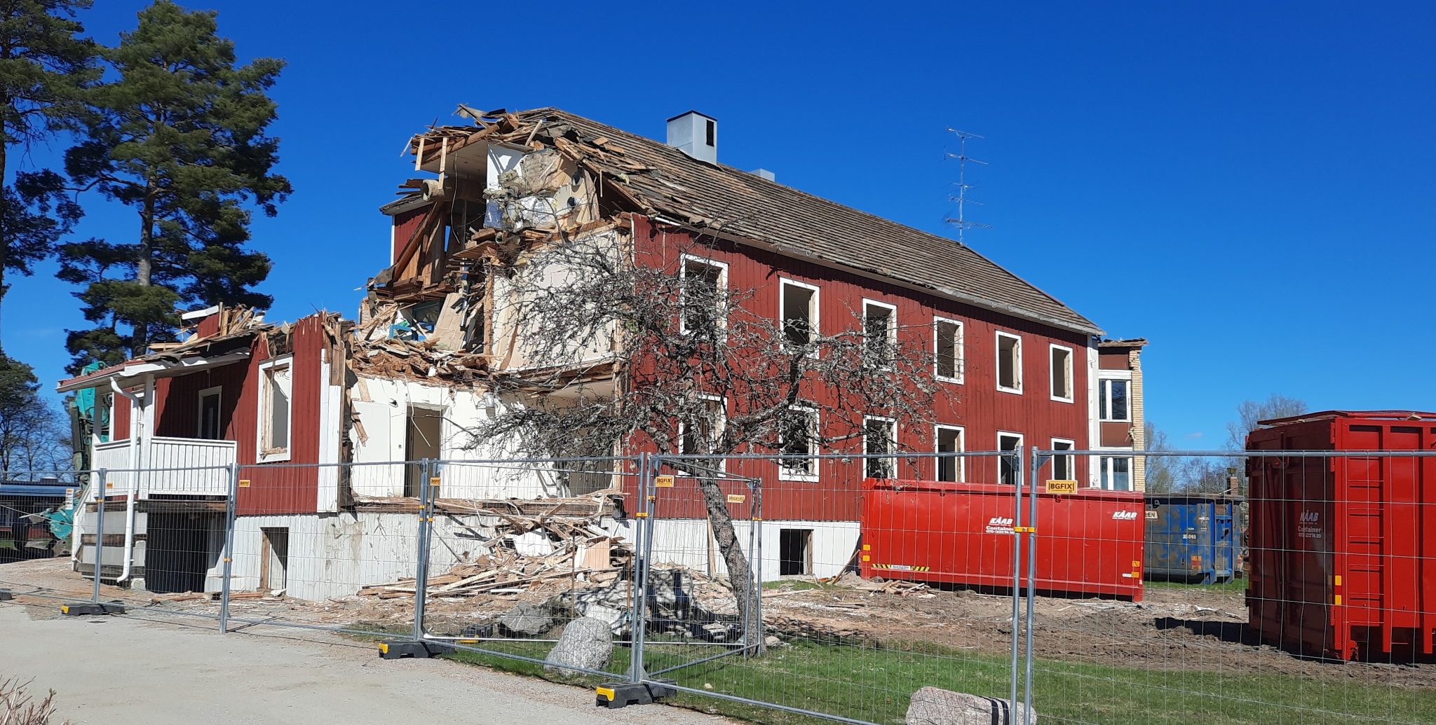 Efter några veckor av stängsling, avstängning av vatten och invändiga förberedelser har nu själva rivningen av Tallgården i Östervåla påbörjats.